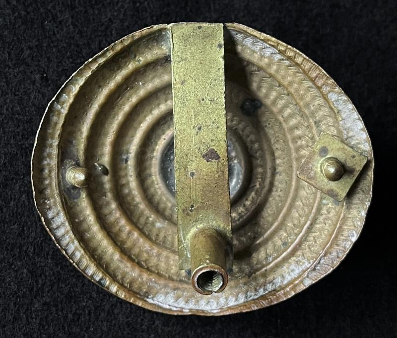 Circa WW1. Plume holder boss for the Lance cap. Round brass with a button to the front. Slot for the plume holder. Correct rear fixings. V.G.C.